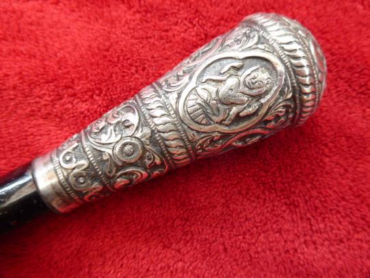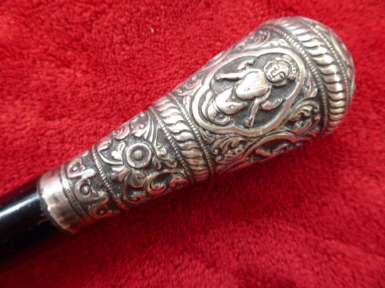 The black lacquered wooden cane is fitted with a beautifully engraved silver top that depicts four Asian Deities or God’s in fine relief work.
