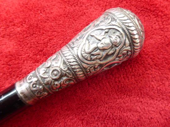 Antique WW1 Period Sword Stick with Ornate Silver Top Set with Four Asian Deities and Silver Collar- Hallmarked Birmingham 1915