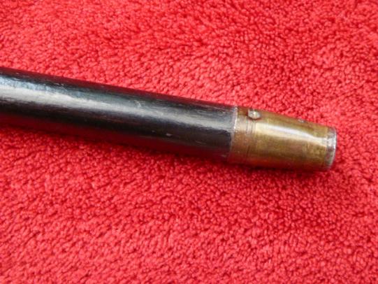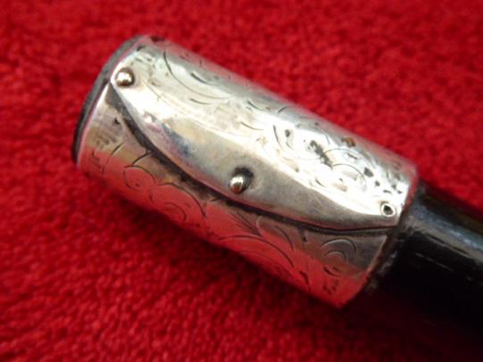 Where the sword fits into the cane shaft, there is a silver collar that has engraved scrollwork and an over cartouche that is still plain. The pinned collar does have a full set of clear English Hallmarks, which show the Lion Passant for English silver, along with Anchor, indicating it was assayed in Birmingham and the date letter ‘q’ for 1915.