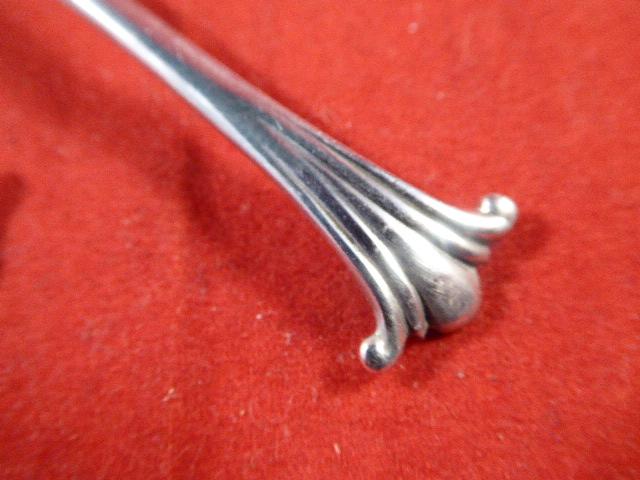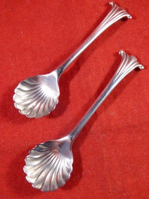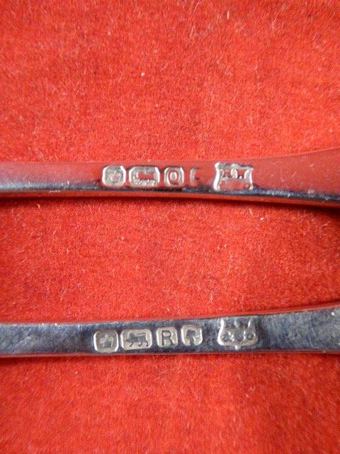 The hallmarks are the Crown for the Sheffield assay office, the Lion for English sterling silver and they are followed by the year mark ‘Q’ on one spoon, for 1883 and on the other spoon, ‘R’ for 1884.