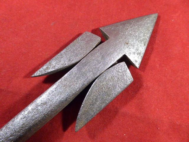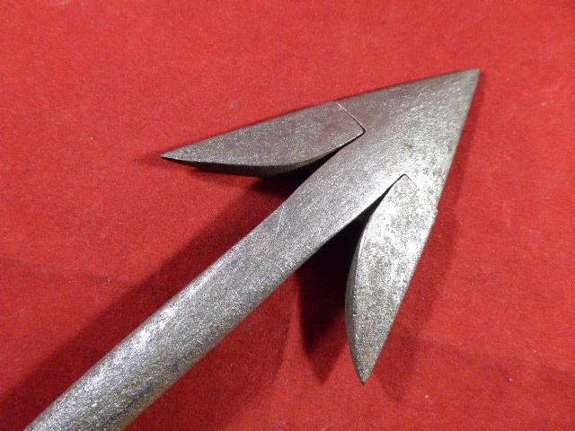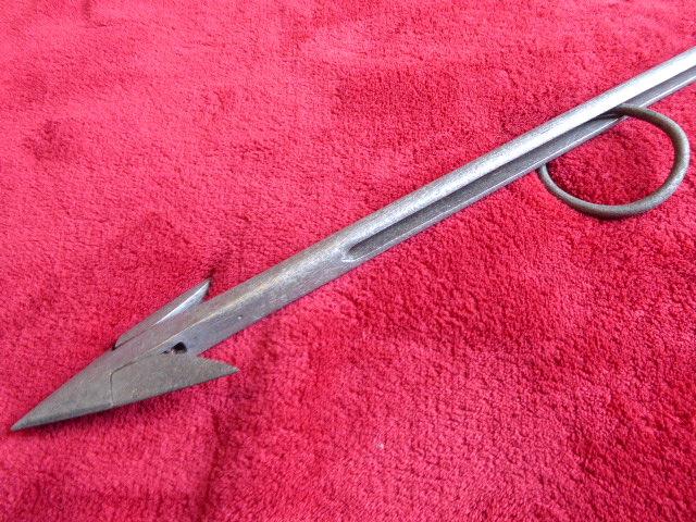This original harpoon has working pivoting barbs at the arrowhead and still retains its original sliding iron ring that was used to attach the line.