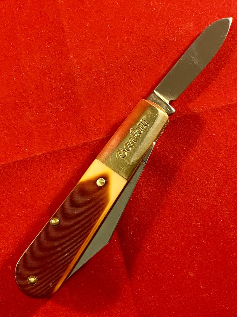 This small Barlow pocket knife has two stainless steel blades; the larger clip point blade is 2.25” long and is stamped on the ricasso with: