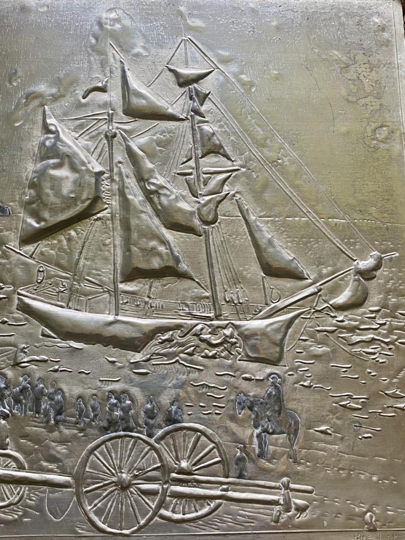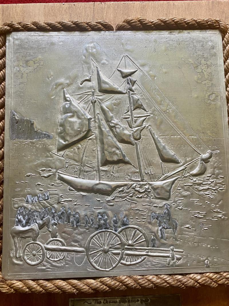 At the bottom, under the image, there is a pewter plaque that has been hand impressed with details of the shipwreck.