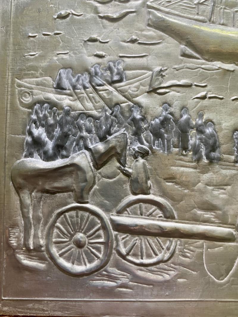 She has used a large sheet of English pewter to produce this impressive artwork, that depicts the image/picture of the shipwreck, using traditional repousse work. It must have taken hours to produce and she has captured a lot of the fine detailing and highlighted the figures on the foreshore and the edge of St Micheal’s mount with a darkened finish to the pewter.