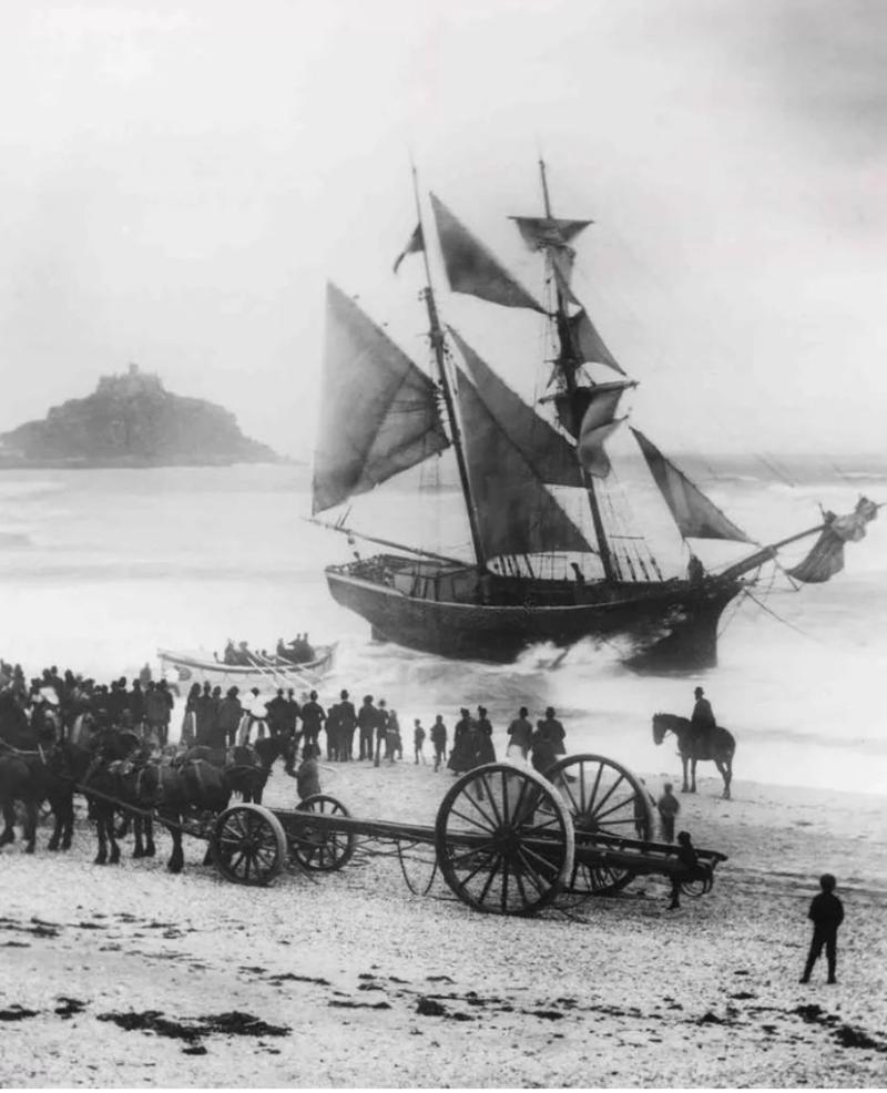Four crew members were on the ship and Penzance’s lifeboat ‘Dora’ was pulled to the shore by a horse and carriage before being rowed out to the ship and managing to rescue all of them.