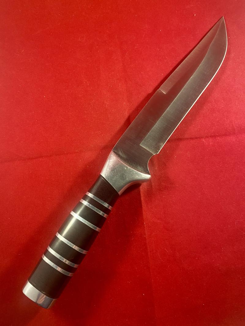 Here on offer is an impressive example of a top quality and substantial Spanish Miguel Nieto S.L handmade hunting knife, with an 8” 440c stainless steel blade and brown leather sheath.