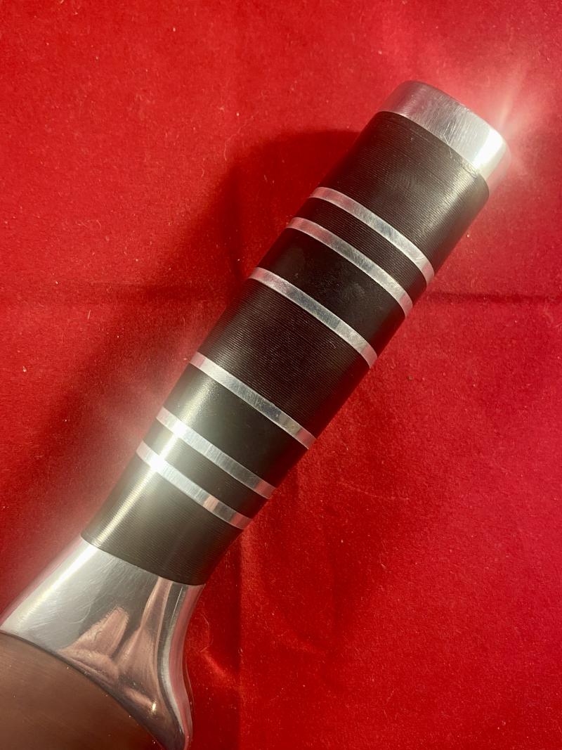 The grip, pommel and bolster have been made from polished aluminium interspersed with turned tapered sections of either a very hard African wood or a composite material, I really can’t tell?