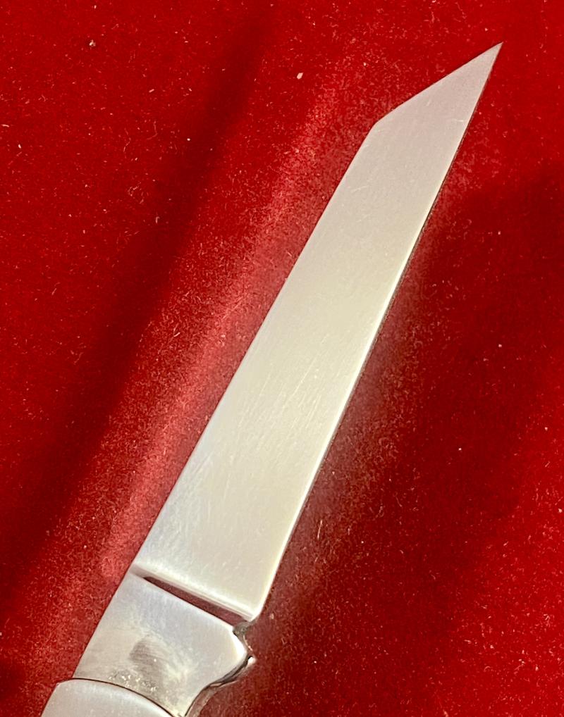 This knife has a mint 2.75” polished stainless steel blade that is stamped on one side of the ricasso with the Jospeh Rodgers makers mark of the Star and Maltese cross stamp and the name: