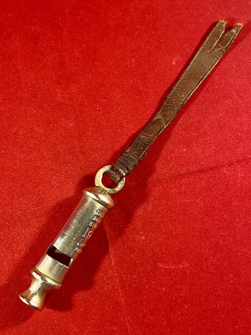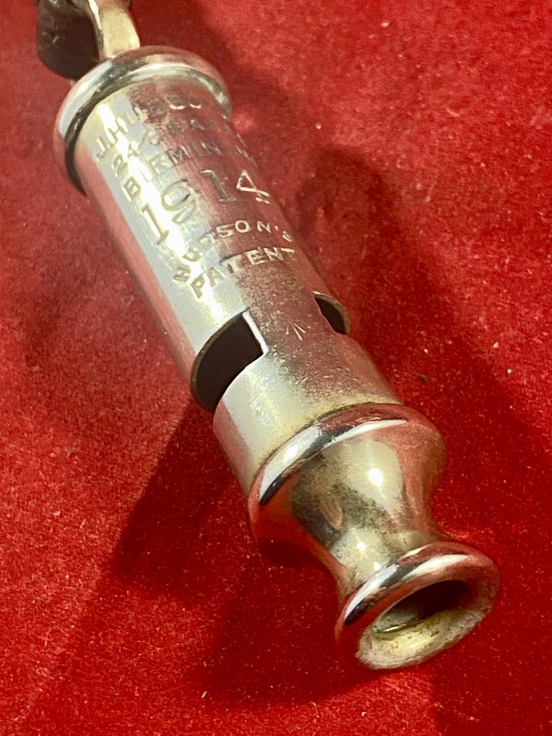 Here on offer is a genuine WW1 1914 British Military Officers trench whistle by J Hudson & Co. of Birmingham with its original leather strap.