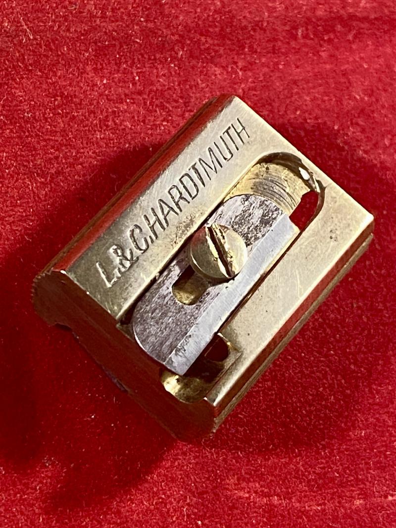 Here on offer is an antique German ‘TUTIOR JUWEL’ brass pencil sharpener with its original leather case, by L. & C. Hardtmuth.