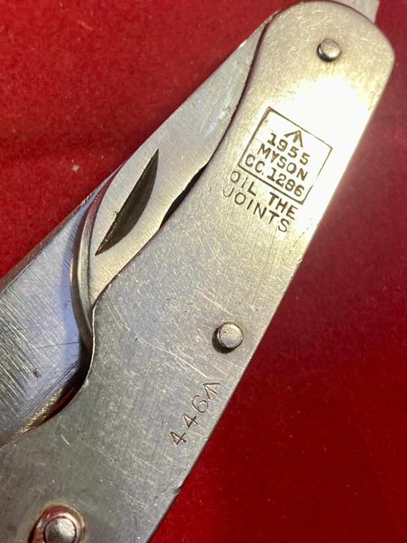 Here on offer is a vintage British military folding, two-piece stainless steel clasp or jack knife, dated 1955 and made by C. Myers & Son Ltd of Sheffield, who had a trade mark of MYSON.