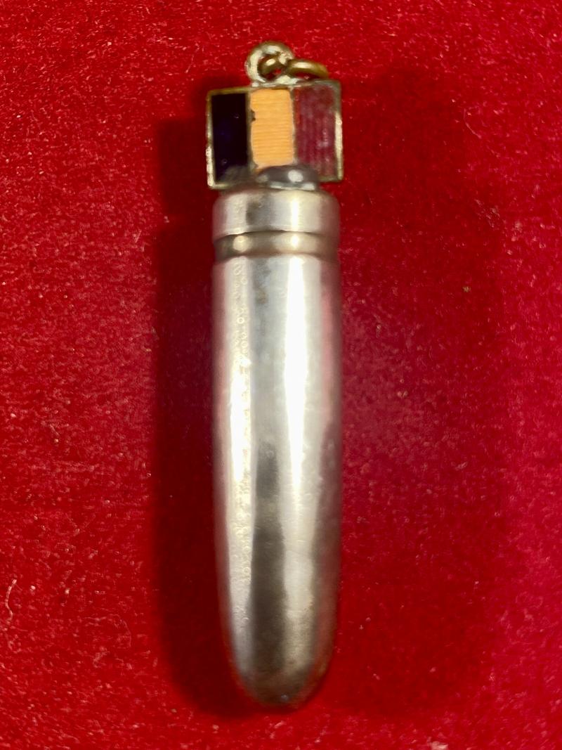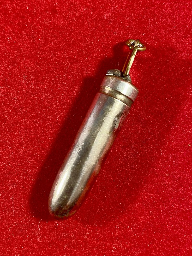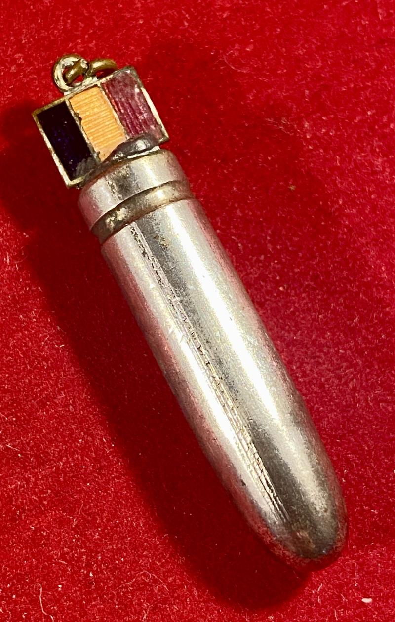 Here on offer is a WW1 British .303 sweetheart “Bullet” pendant, with a miniature, red yellow and black enamel Belgium flag at the top. The flag has been quite crudely soldered in place, but these where possible made as "trench art" pieces, so not the best quality.