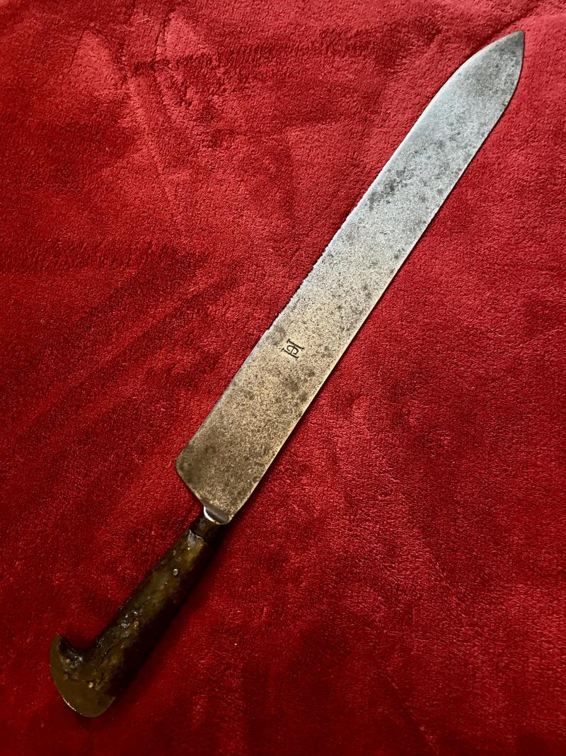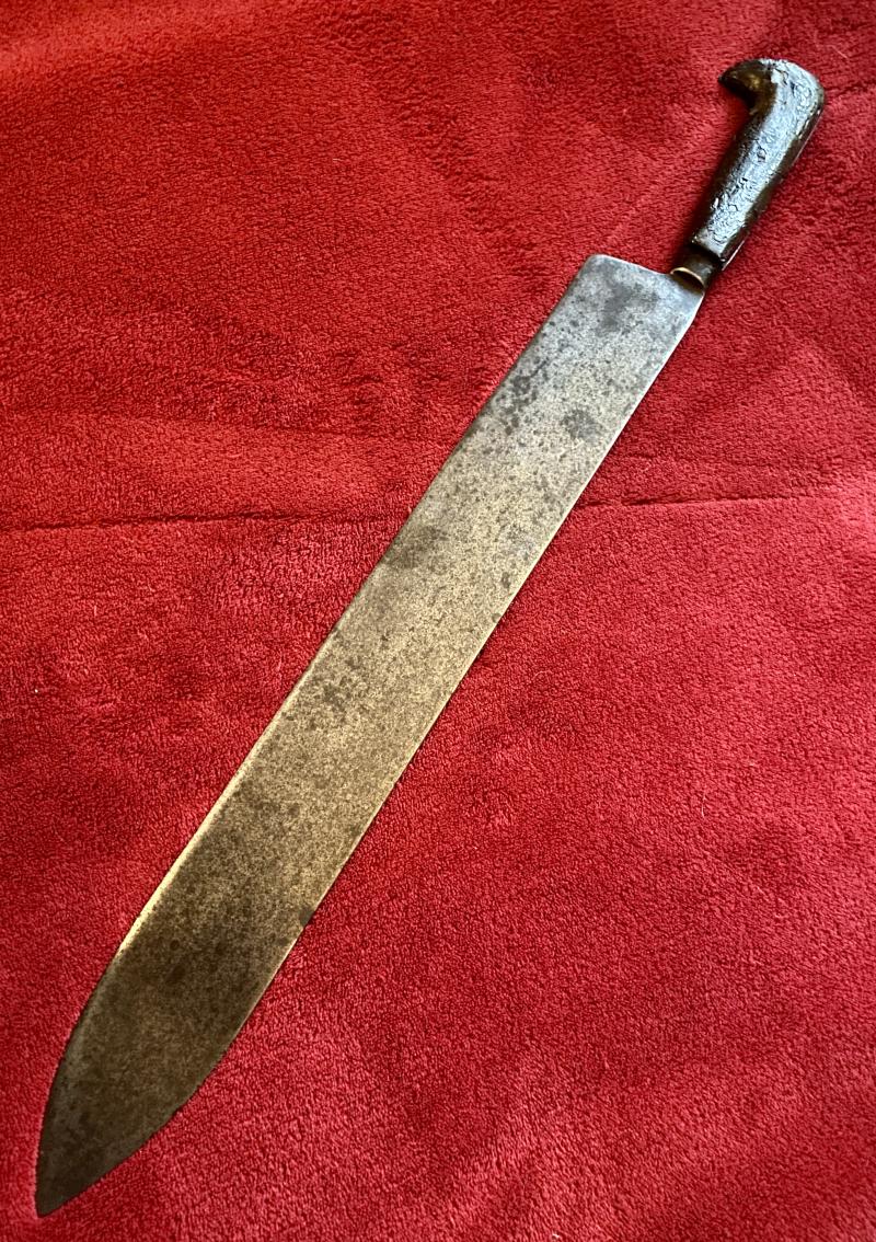 Here on offer is an unusual and rare, 18th or 19th century large 18” spearpoint bladed short sword or machete, with horn grip slabs.