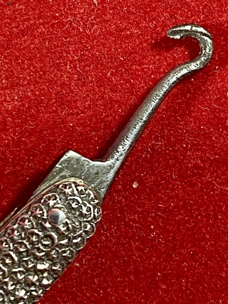Antique Miniature Ladies Chatelaine Folding Glove Button Hook with Ornate Silver Handle Scales c1890