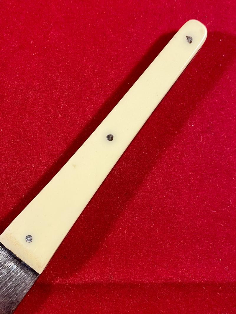 The tapering grip is made from two sections of what look like ivory coloured celluloid, fixed to the tang by three stell pins. The grip is in excellent undamaged condition.