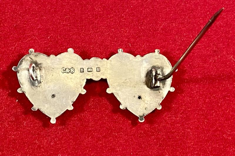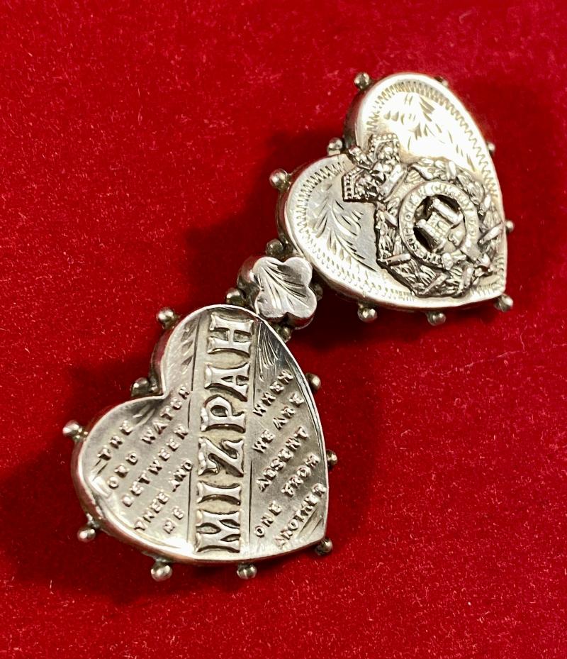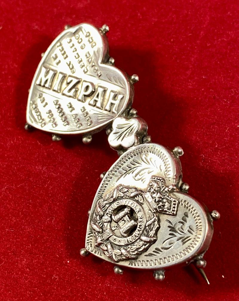 Pre WW1 Hallmarked Silver MIZPAH and Suffolk Regiment Double Heart Sweetheart Brooch by C&S - 1907