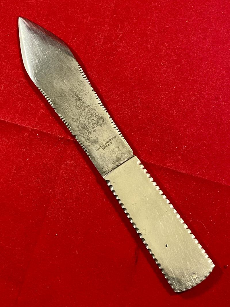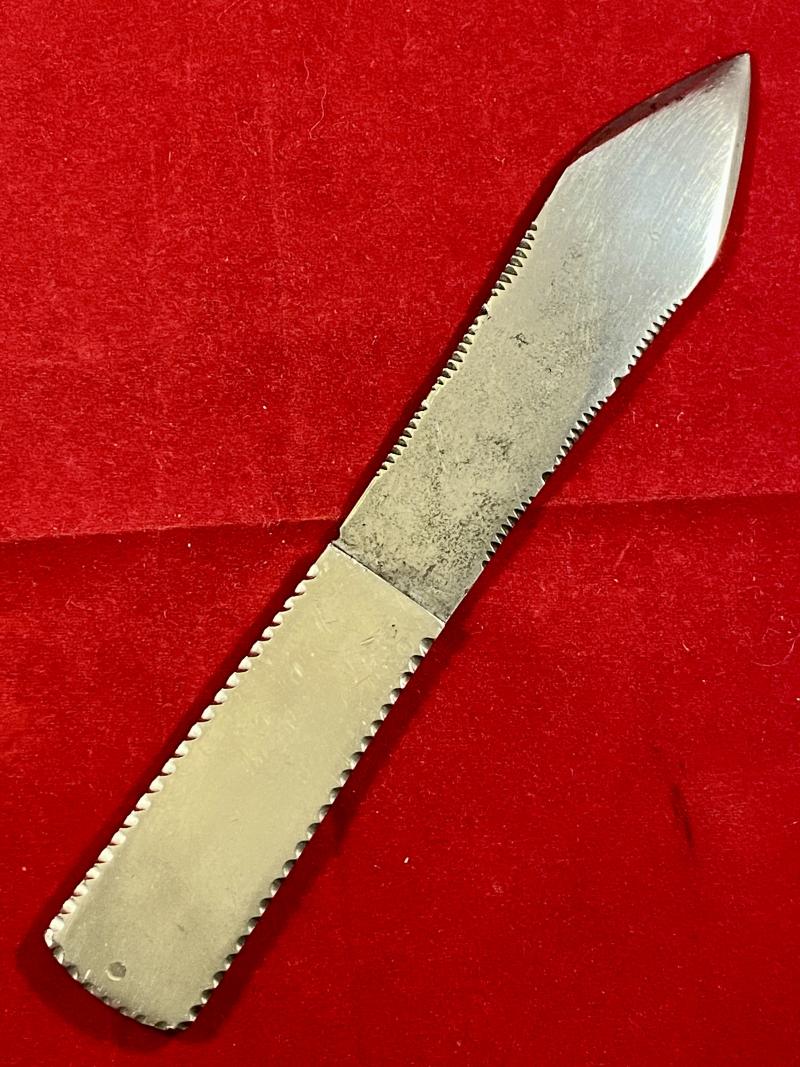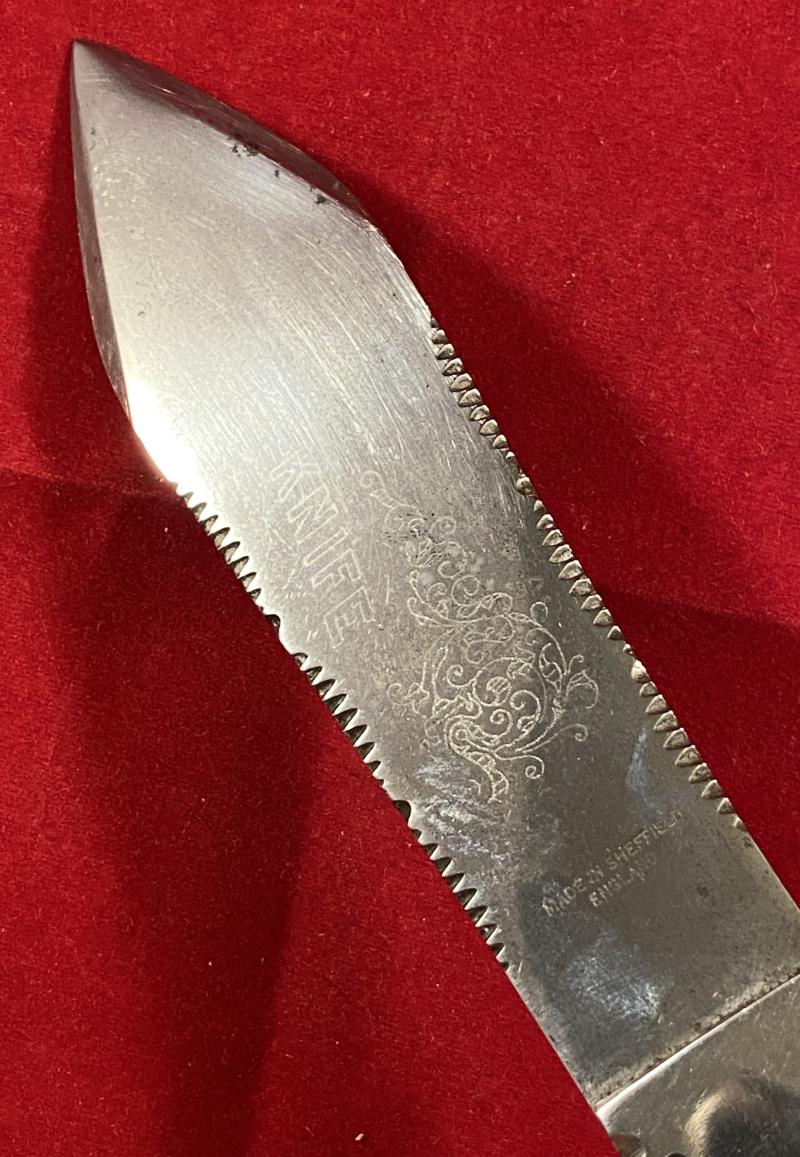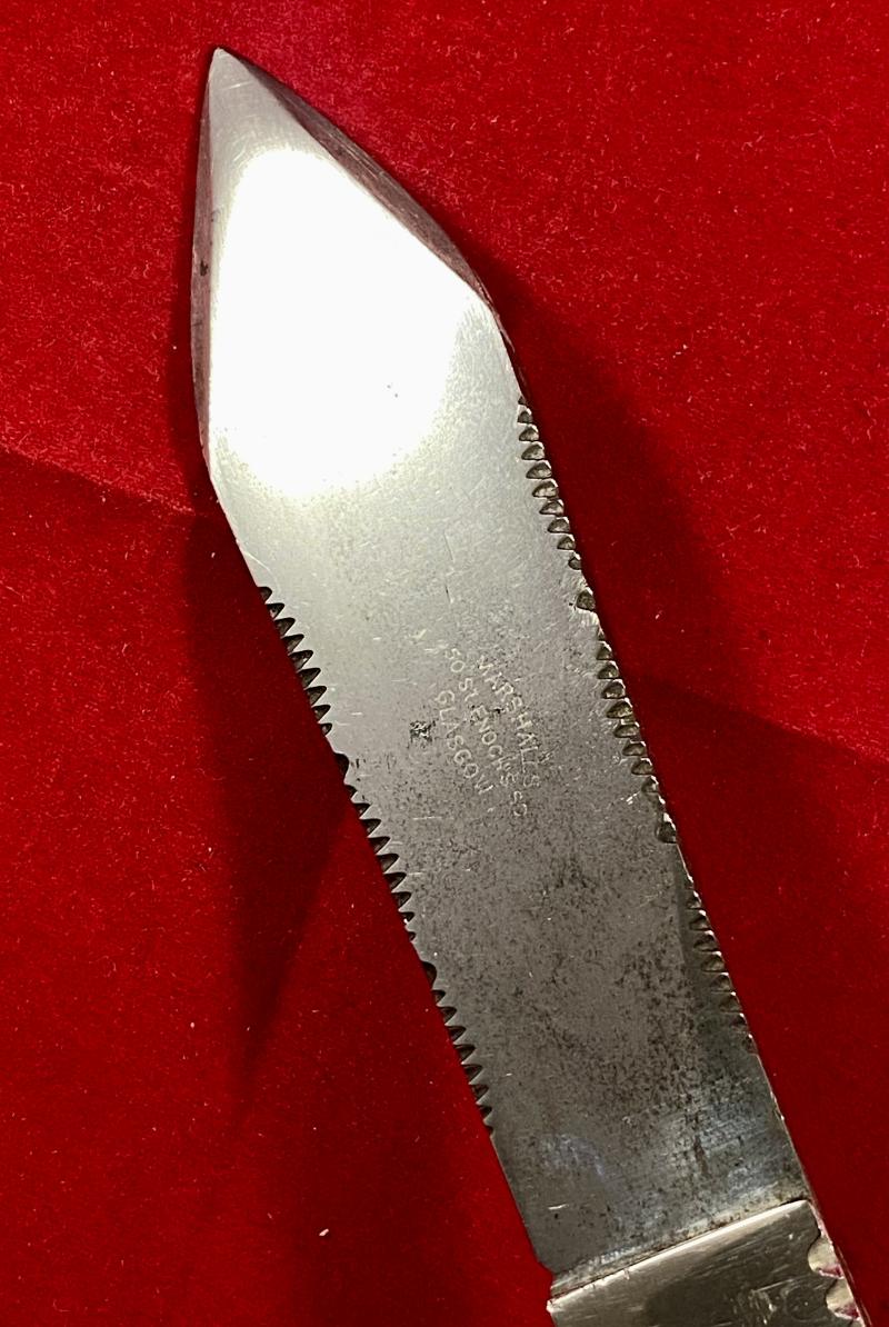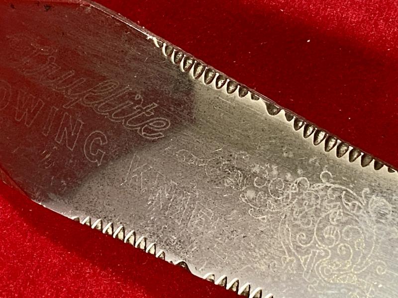My understanding is that this type of TRUFLITE throwing knife was only made by William Rodgers of Shefield. Other examples I have seen that use this blade and TRUFLITE name, are etched with ‘I CUT MY WAY’ William Rodgers, Sheffield. Just this example isn’t?