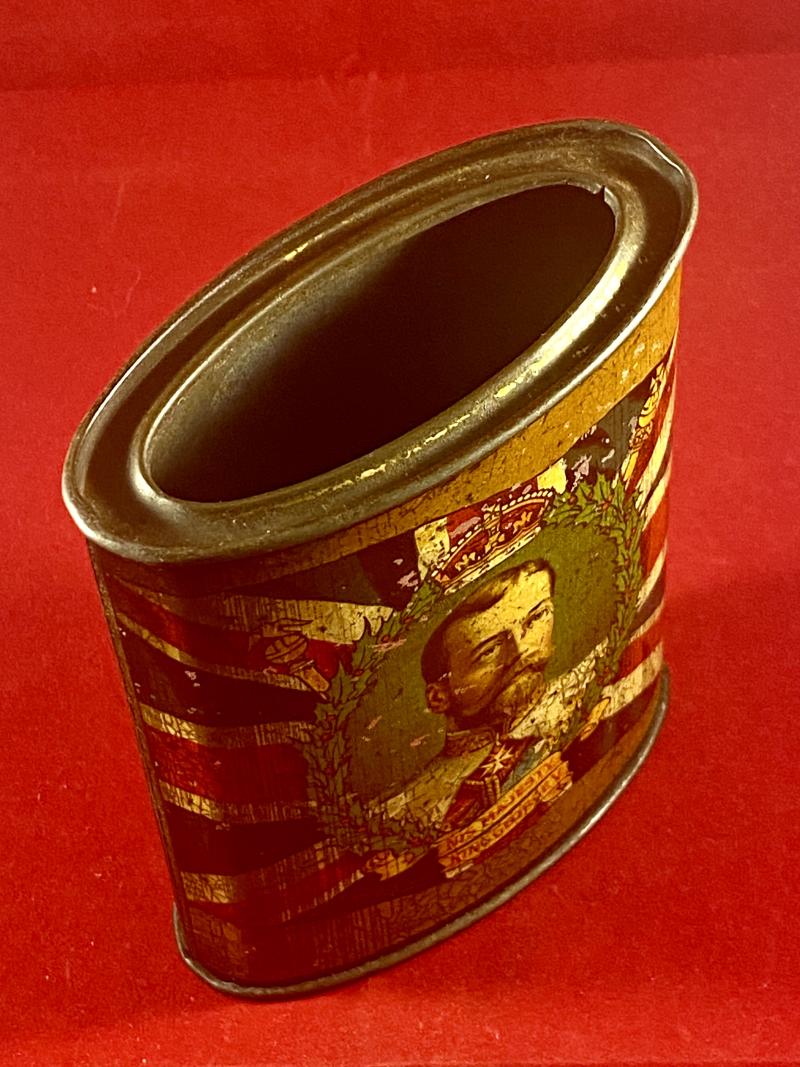 The cylindrical tin is empty and is decorated on front with the Union Flag and head and shoulders portrait of King George V, enclosed within a crowned holly wreath.