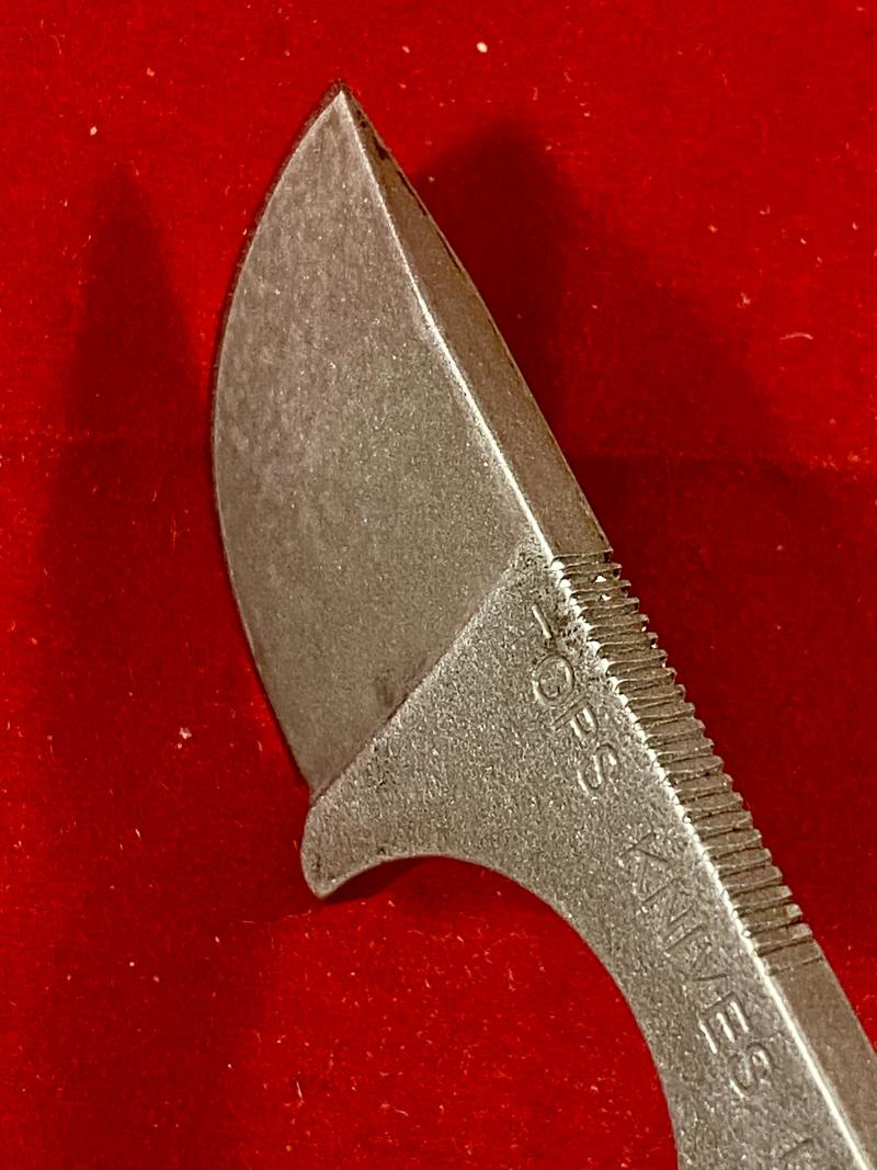 This neck knife is formed from one piece of high grade carbon steel and features a curved sharp 1.25” cutting edge. It has a curved finger recess that has a grooved finish on the top edge, to aid with gripping the knife.