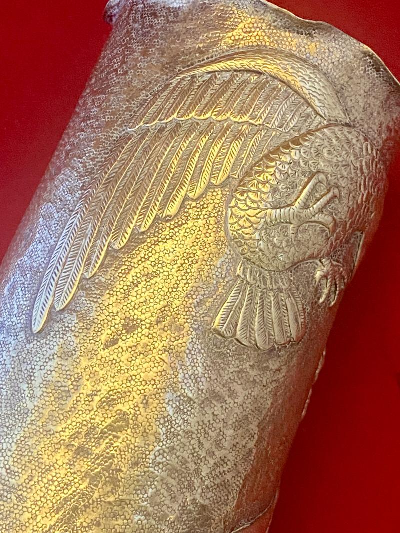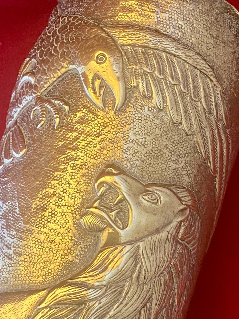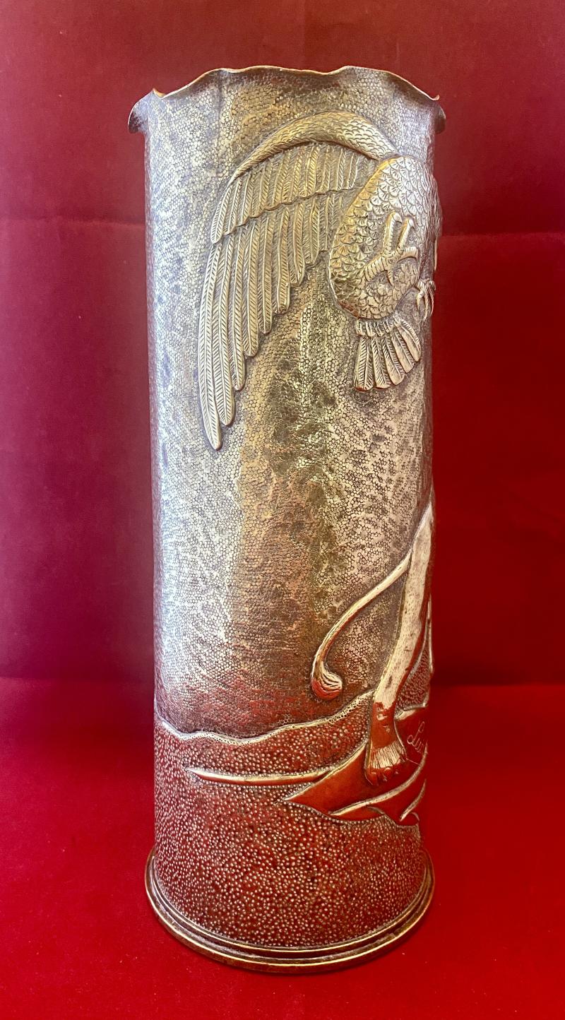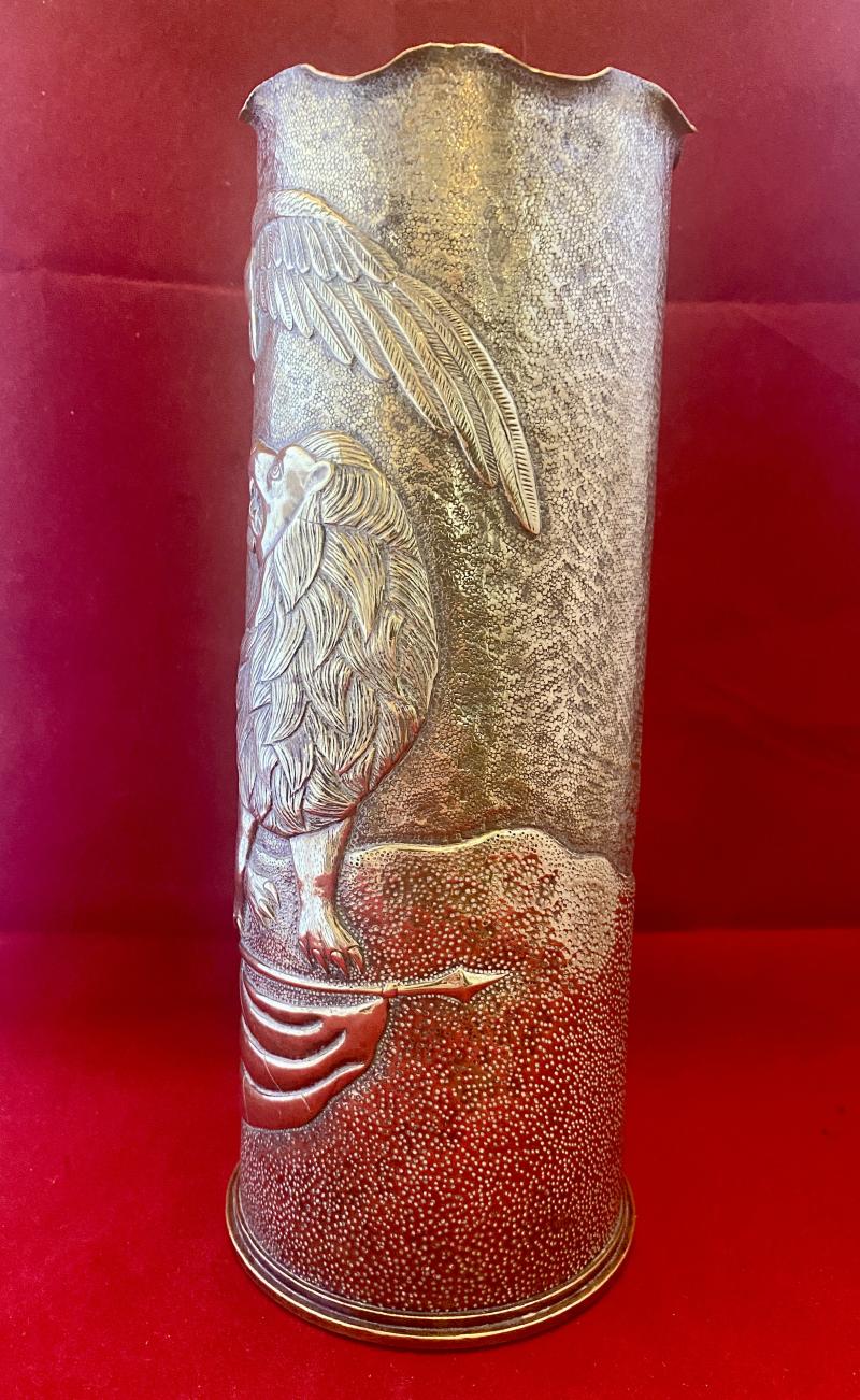 There were thousands of decorated WW1 artillery shell cases made during and after WW1, but occasionally you come across a piece that truly stands out and in my opinion this is such a piece. The quality of the embossing is exceptional, making it a true “work of art”.