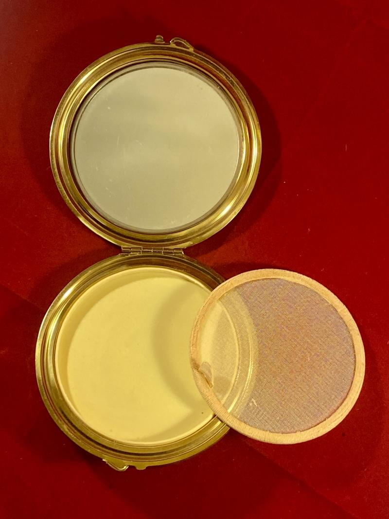 Inside is an undamaged round mirror and the original sifter disc. There is no powder with this compact, but you can just smell the light powder scent, so powder has been used in it before.