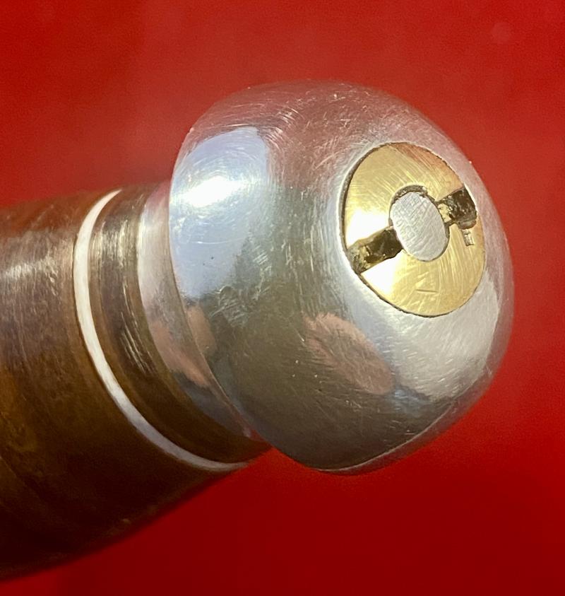 It has a shaped leather-stacked handle that is topped with a polished domed aluminium pommel.