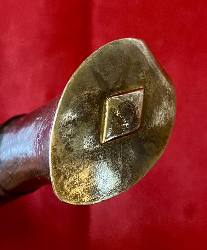 The bolster and pommel cap are made from steel The oval pommel is fixed securely to the tang holding the grip firmly. The tang tip has been hammered over against a raised steel diamond plate in the centre of the pommel and has a smooth finish. One of the tips of the oval pommel has been bent over and has caused a small chip to the grip.