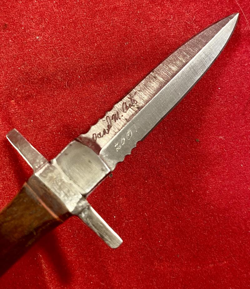 It comes with some provenance, being a hand written and signed card by Dan Certo himself, explaining the details about the knifes construction and dated 12th August 2001. I think these are possibly the only two neck knives he ever made in his shop, as he states amusingly on the card, that “They are mostly just for fun but are heat treated and will hold an edge and cut like a larger knife”. This card is also included with the sale of these knives.