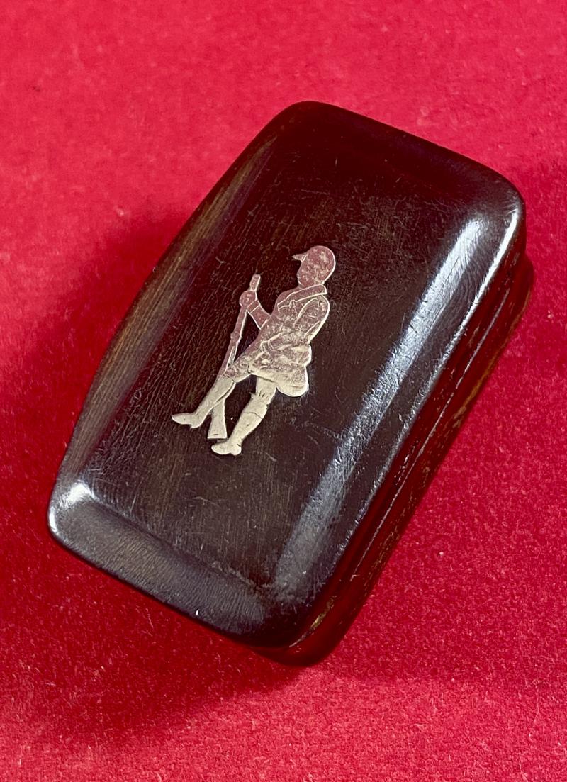 Here on offer is charming small Victorian or possibly Georgian horn snuff box, with a hinged lid and the figure of a man holding his shotgun inlaid in silver on the lid.