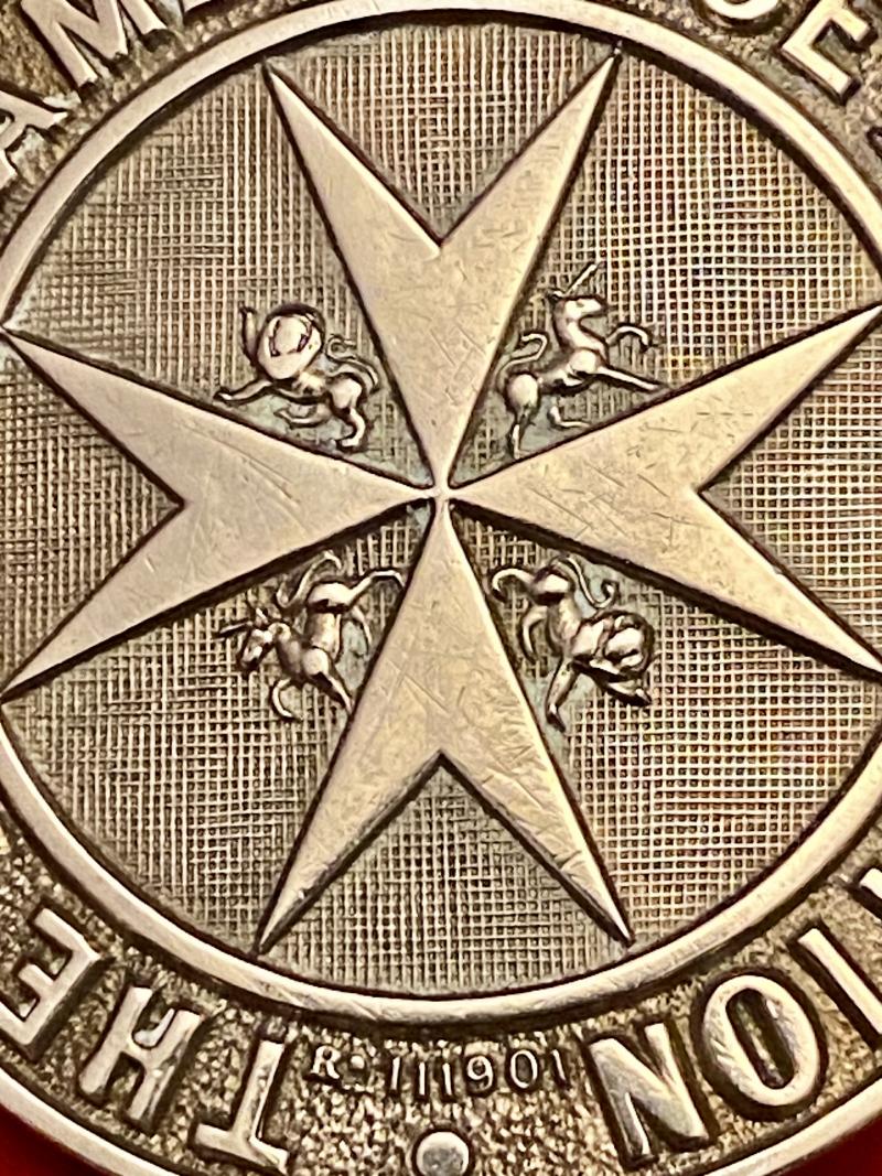 It depicts the logo, being a raised eight pointed Maltase Cross, with the lions and unicorns, surrounded by the words: