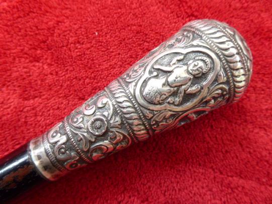 The black lacquered wooden cane is fitted with a beautifully engraved silver top that depicts four Asian Deities or God’s in fine relief work.