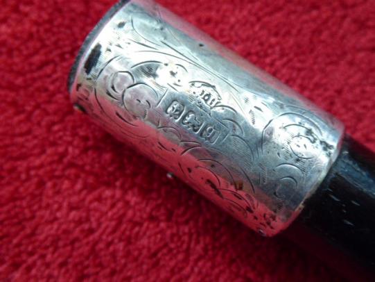 Where the sword fits into the cane shaft, there is a silver collar that has engraved scrollwork and an over cartouche that is still plain. The pinned collar does have a full set of clear English Hallmarks, which show the Lion Passant for English silver, along with Anchor, indicating it was assayed in Birmingham and the date letter ‘q’ for 1915.