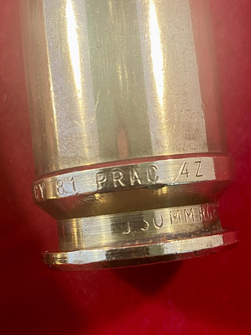 There are various ordnance markings around the lower circumference and recess of the brass shell case: