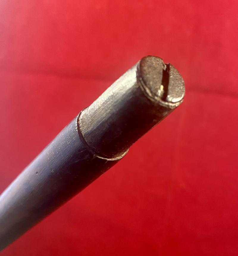 The olive wood shaft is in excellent condition and seems to have lost the original metal ferrule cover, but has a very old large iron screw fitted in the tip acting as a ferrule tip.