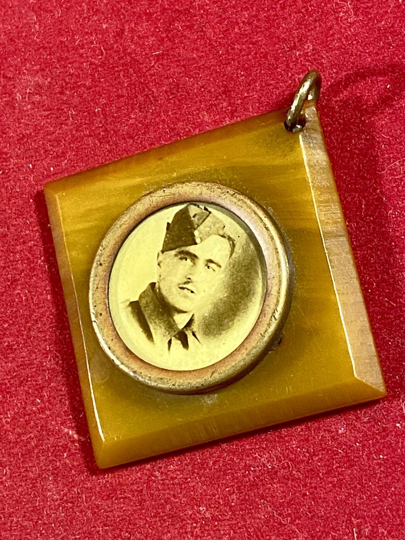 Here on offer is a fine example of a WW2 butterscotch coloured Bakelite sweetheart pendant, inset with a sepia photo of a soldier in uniform.
