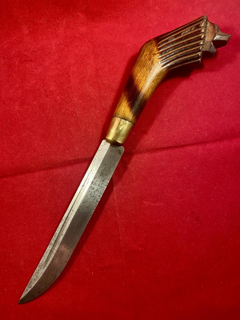 Here on offer is a large and beautiful hand carved set of antique “Bear Head” Finnish Puukko knives, in their carved wooden sheath.