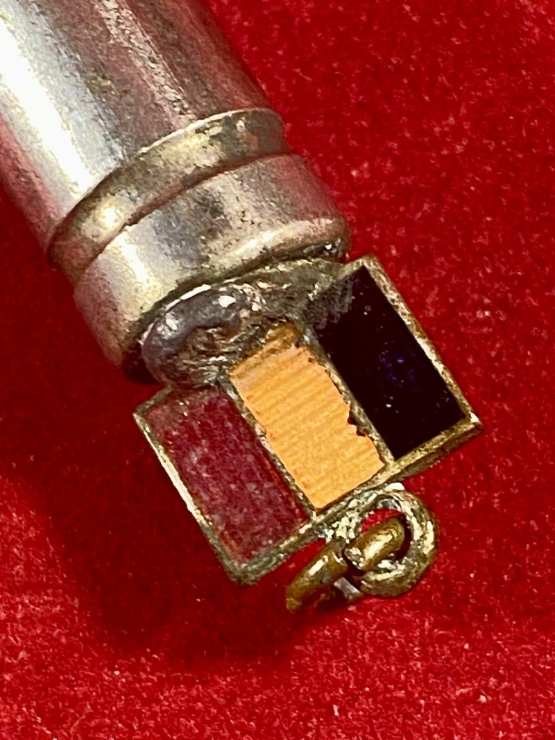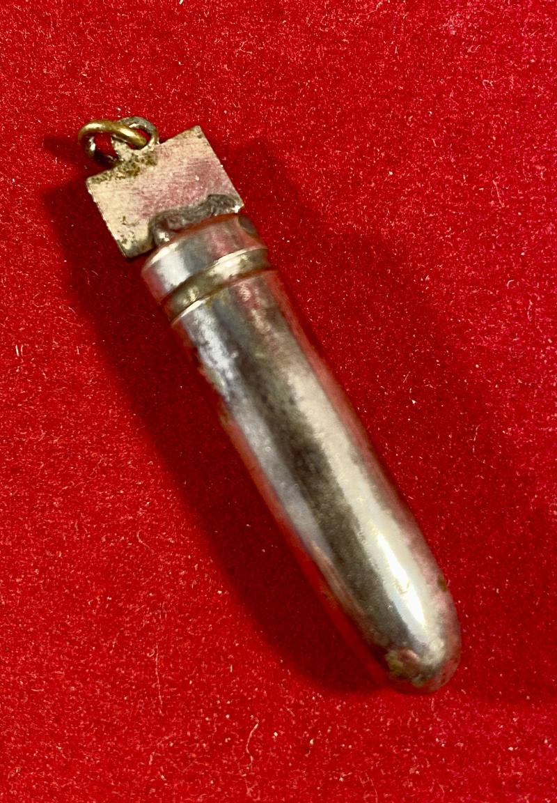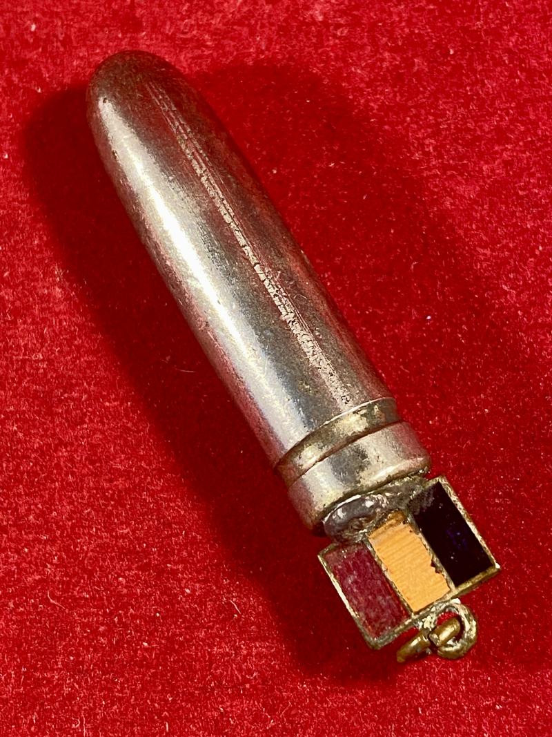 Here on offer is a WW1 British .303 sweetheart “Bullet” pendant, with a miniature, red yellow and black enamel Belgium flag at the top. The flag has been quite crudely soldered in place, but these where possible made as "trench art" pieces, so not the best quality.
