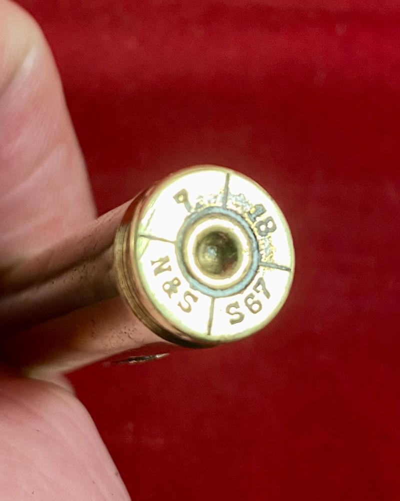 The base of the fired and now INERT cartridge case is stamped with the markings: N & S, S67, 7 and 18.