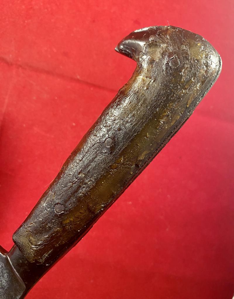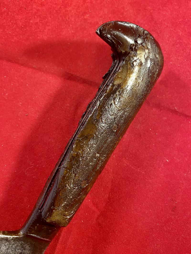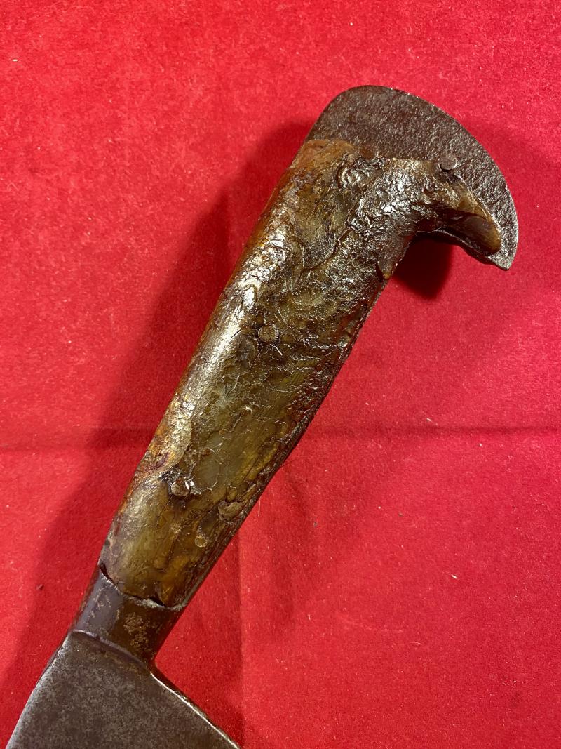 Here on offer is an unusual and rare, 18th or 19th century large 18” spearpoint bladed short sword or machete, with horn grip slabs.