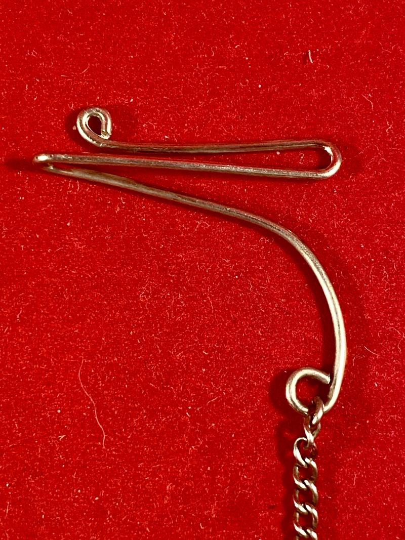 The pendant is suspended by a chain that connects to an unusual lapel or tie bar wire fitting, both of which seem to be made from silver, but haven’t been tested.