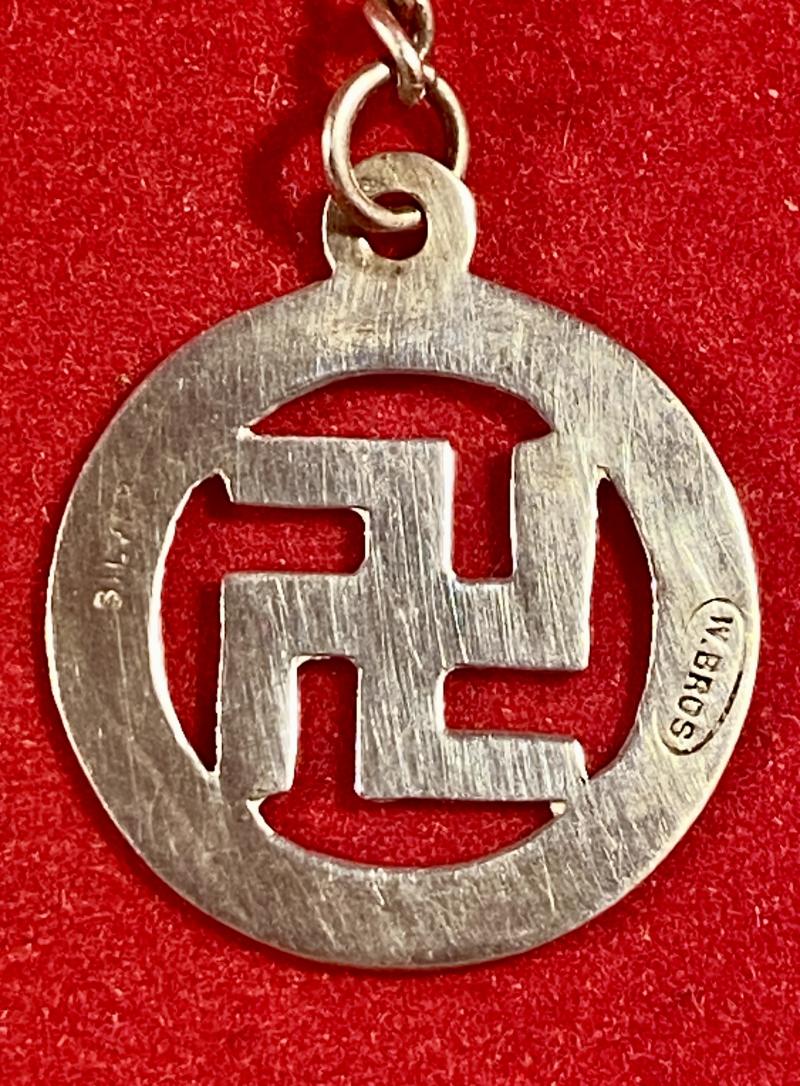 Here on offer is a sterling silver Swastika pendant with lapel/tie bar and chain by W.BROS, circa 1930.