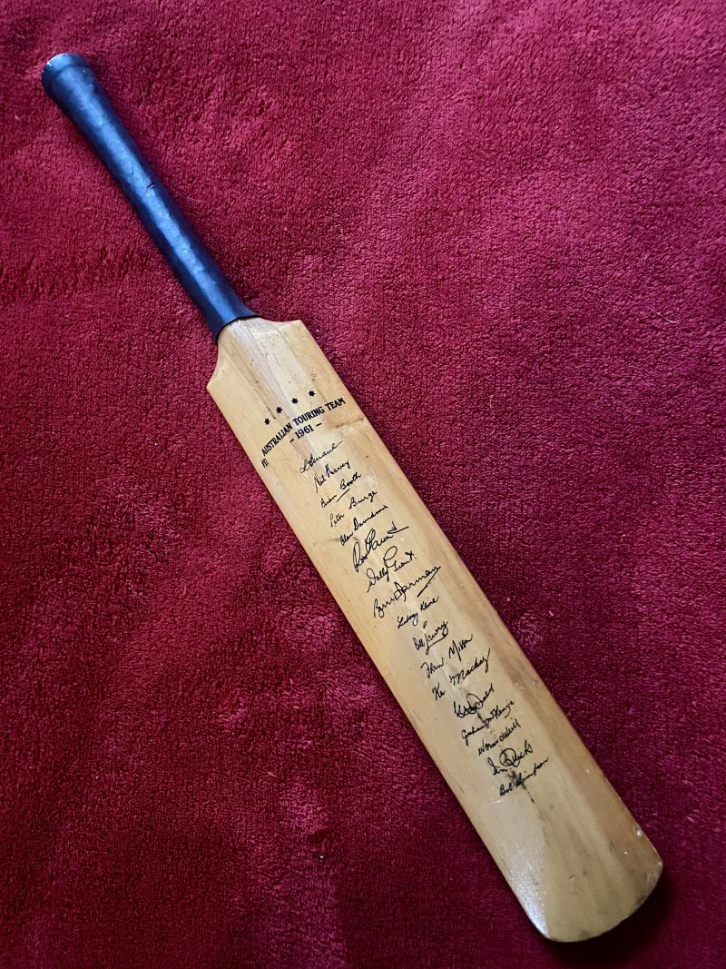 “The combined playing record of the 33 former England cricketers whose signatures appear on the bat together with the 1961 Australians, involved 737 Tests – 351 of them against Australia. All were the guests of Rothmans of Pall Mall at a reception at Lord’s Tavern on Monday July 24 1961.”