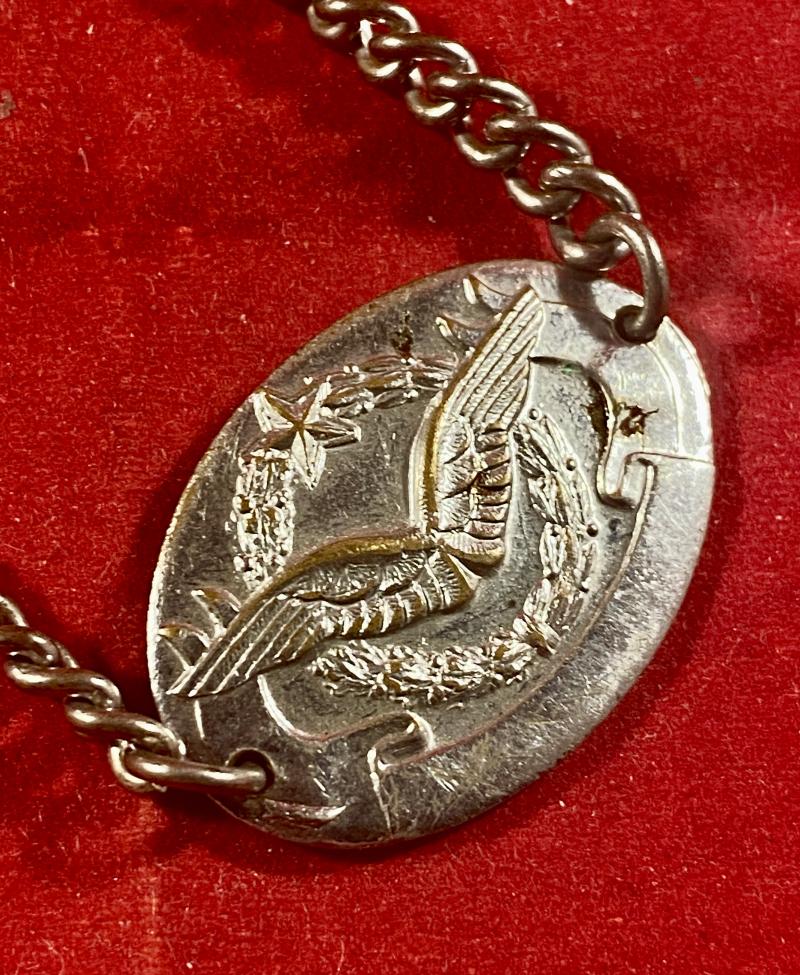 On the front of the plated oval disc, it depicts the image of a French pilot’s insignia, a five-pointed star and a set of spread wings, on top of a laurel wreath. Below the wings there is a blank ribbon shaped section that could be engraved with the owner’s name. His details could also be engraved on the back of the disc.