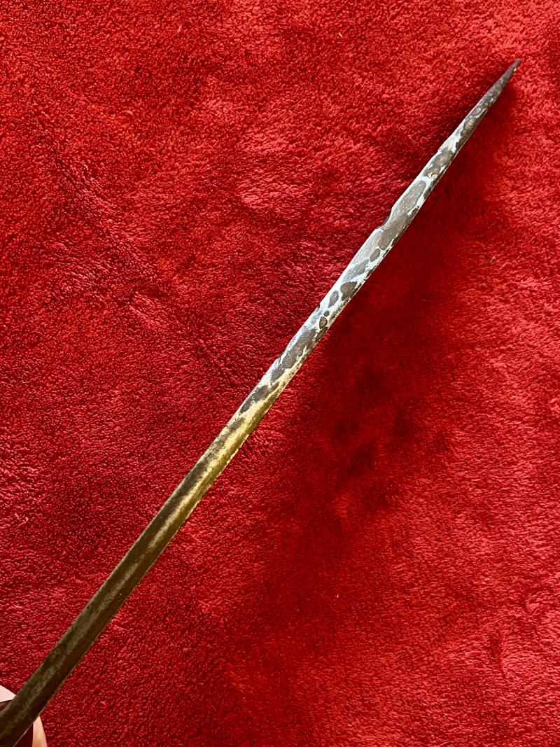 The heavy fine quality blade is actually in great condition, still straight and it retains a sharp cutting edge. It now has a dark patina to its finish, some of which would probably polish out, if required.