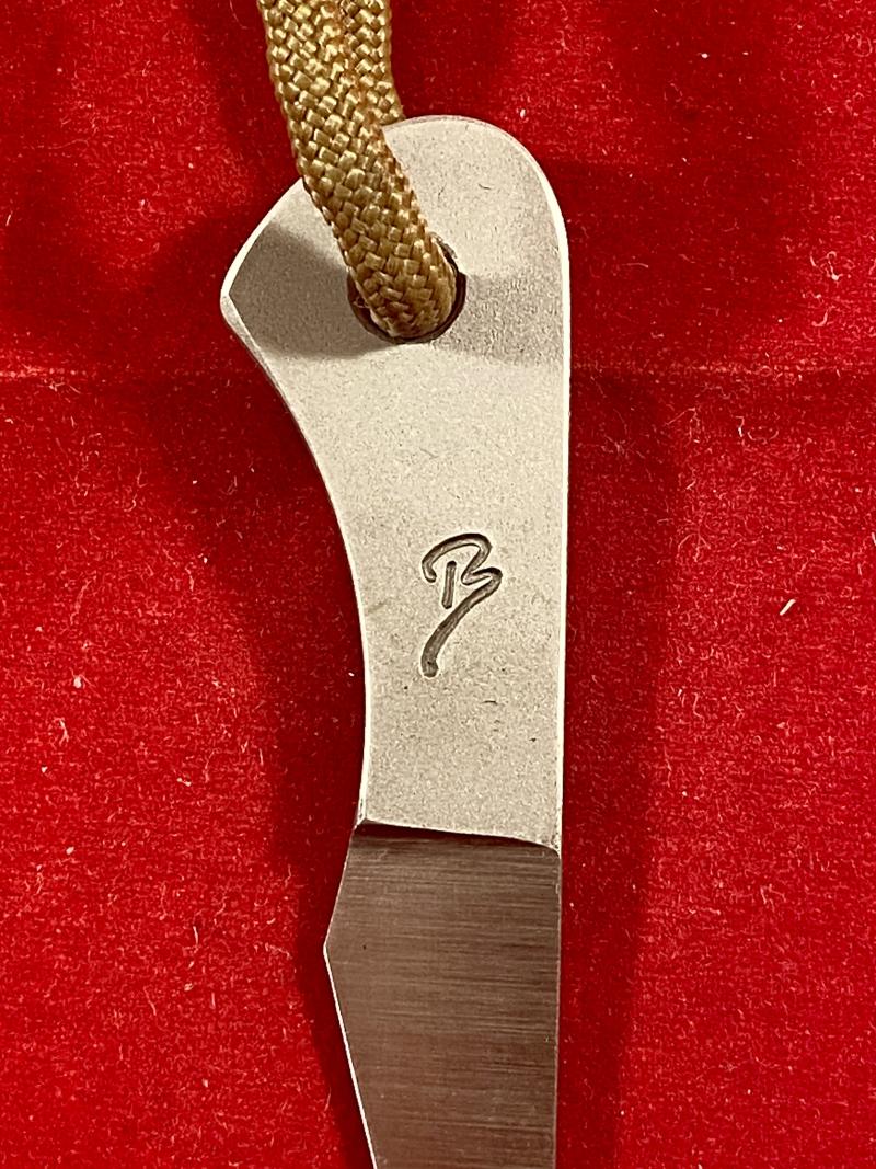 Making it easy to keep close at hand, the Kiridashi knife is accompanied by a custom fit black Kydex neck sheath, that has holes to enable a neck chain to be fitted. The sheath is also stamped with the maker’s letter “B” mark.
