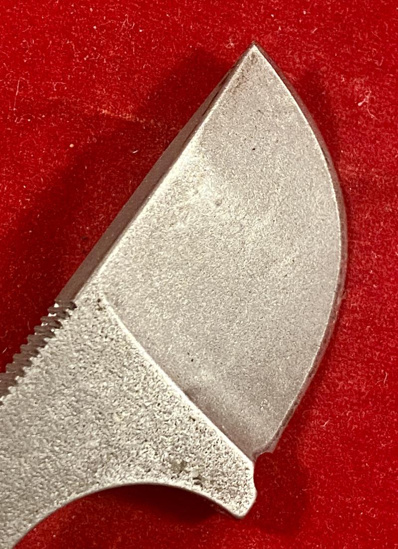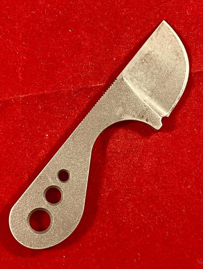 This neck knife is formed from one piece of high grade carbon steel and features a curved sharp 1.25” cutting edge. It has a curved finger recess that has a grooved finish on the top edge, to aid with gripping the knife.