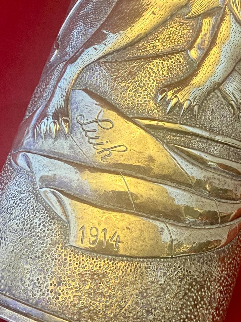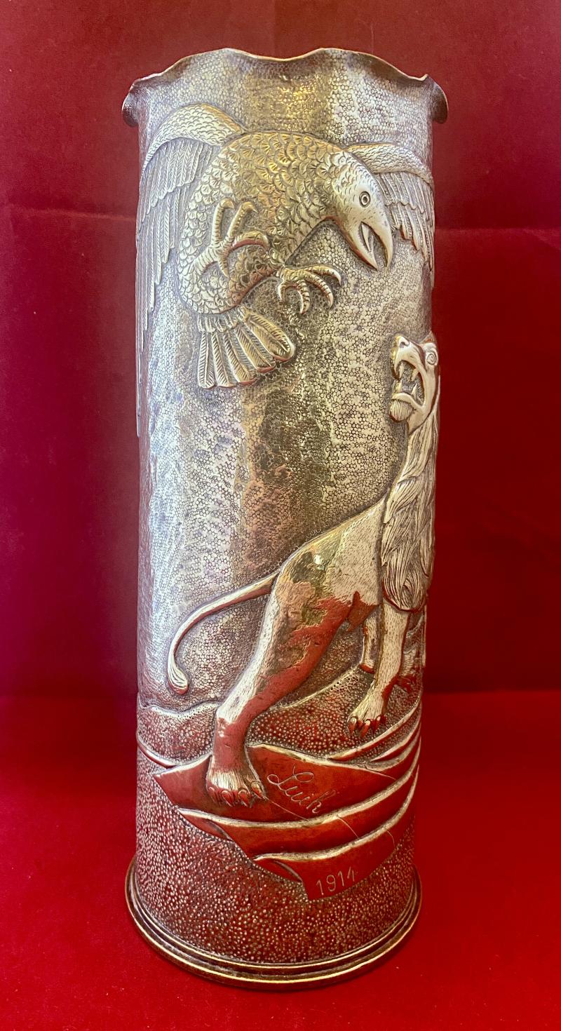 Stunning WW1 Trench Art British 18 Pounder Field Gun Embossed Brass Shell Case Commemorating The Battle of Liège 1914