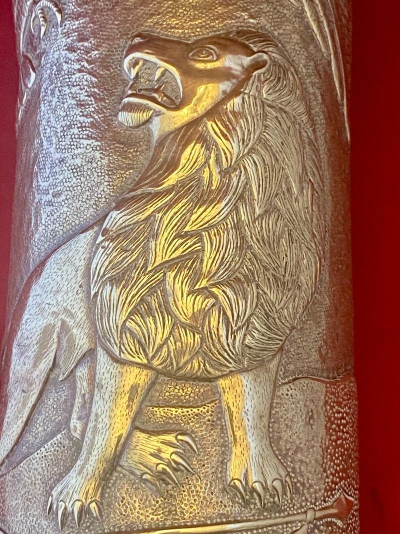 There were thousands of decorated WW1 artillery shell cases made during and after WW1, but occasionally you come across a piece that truly stands out and in my opinion this is such a piece. The quality of the embossing is exceptional, making it a true “work of art”.