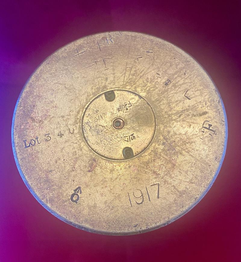 The base shows the stamped British ordinance marks for an 18 pounder, dated to 1917. Therefore this piece has clearly been made 3 years after the battle, as a commemorative piece and before Liège was repatriated at the end of 1918.