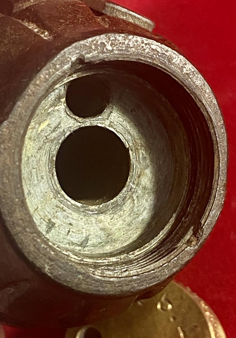 The explosive was filled through the small circular brass or alloy screw plug on the upper half and the detonator assembly was inserted into the centre tube of the mills through the bottom of the grenade body via the base plug.